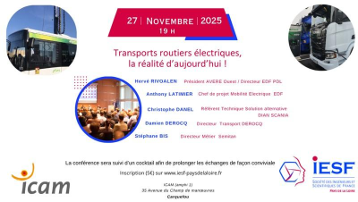 ICAM et IESF Pays de la Loire - 27 novembre 2025 - Conférence sur les transports routiers électriquesNous avons le plaisir de vous convier à une conférence passionnante qui explorera les avancées dans les transports routiers électriques. En 2024, 40 millions de voitures...